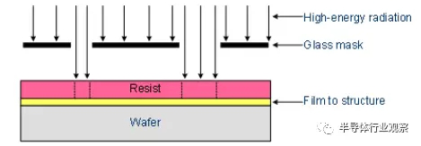c、投影式曝光(Projection Printing)。在掩膜板与光刻胶之间使用透镜聚集光实现曝光。